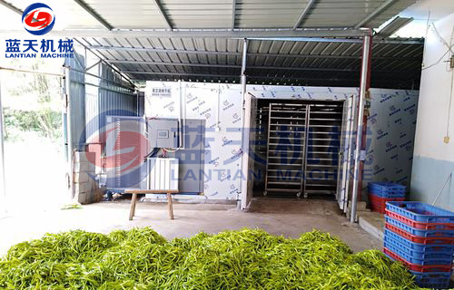 先把黃花菜均勻的攤放在推車托盤上,推車托盤最要用不銹鋼制作的,有利于加快干燥的時間。每層大約攤放7公分厚。層與層之間要預留8公分的距離,確保每層的通風效果。一部推車最好不要超過15層。裝好后放在烘干房內。