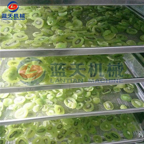 將糖煮好的獼猴桃果實撈出,瀝干糖液,放在竹篩網(或不銹鋼網)上,送入烘房內烘干。烘干時應將前期溫度控制在50℃,待果實半干時,再將溫度提高到55~58℃,繼續干燥20小時左右即可。干燥好的果脯要求外部不粘手,捏起來有彈性。