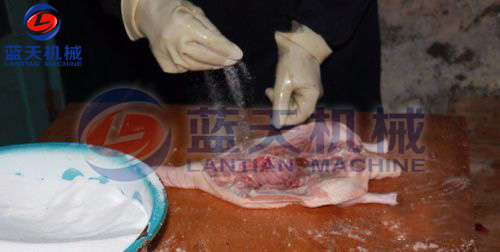 鴨只屠殺之前應予12~24小時絕食,并給以充分清水,使之安靜休息。如此可使屠殺放血良好,并可減少未完全消化的飼料污染屠體的機會。經屠殺后,將屠體外表洗凈,祛除余毛,并應即速冷卻。鴨之屠體選用無骨折及瘀血斑點者,并將鴨只在肘關節及跗關節下端分別將兩翅及兩腳去掉。以左手抓住鴨之下額骨,右手持刀從口腔割掉帶舌的下額部,此處理俗稱割外五件。