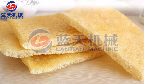 用錐形高壓半自動膨化機,加熱升溫,使機膛內壁升溫均勻,將干燥處理好的豬皮塊1~1.5公斤裝入機膛內,加入適量膨化劑,扣緊封閉壓力開關,迅速加熱升溫,使機內溫度達150~180℃,每分鐘轉速為80~100轉,機內產生一定的壓力,隨著溫度的升高,經5~7分鐘,壓力達到10個表壓(壓力表指到10)時,停止加熱,打開壓力開關,即可噴爆,將膨化好的豬皮裝入塑料袋中,封口即為成品。