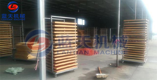 踩堆發汗:即將含水率75%一85%的辣椒,第一次將辣椒烘干到含水率50%踩堆發汗,再進行第二次烘干。踩堆發汗在辣椒干燥工藝中是一個很重要的步驟,是否采用這一步驟對辣椒品質和烘干時間、都有很大影響。辣椒在烘干過程中都有明顯的軟化和膨脹現象。踩堆發汗的主要作用是調質,使辣椒油向表面滲透,烘干后的辣椒顏色一致,紅潤光滑,并促使辣椒含水率趨于平衡。如不進行踩堆發汗,烘干1000公斤辣椒,熱風溫度40℃—60℃時 需時間63小時,踩堆發汗后則可縮短到40小時左右,且花黃殼顯著減少。