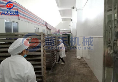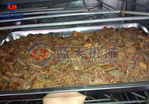 紅糖烘干工藝:將紅糖磚切成方塊狀,置入托盤中,在物料架中分層放好,注意層與層之間的距離,將物料車推入烘干房,開始啟動溫濕控制系統,在紅糖烘干機的使用過程中,第一個小時可以只升溫不排濕,因為在工作的第一階段,烘干房里面的濕度很低。第二階段設定為烘干加排濕的工作程序模式。紅糖烘干機帶有余熱回收功能。在排濕過程中的熱量會重新參與到烘干房的熱循環。排濕過程當中不會造成熱量浪費,從而降低了運行成本。