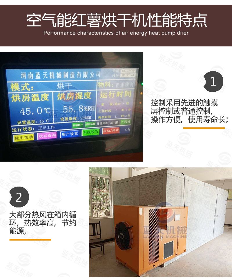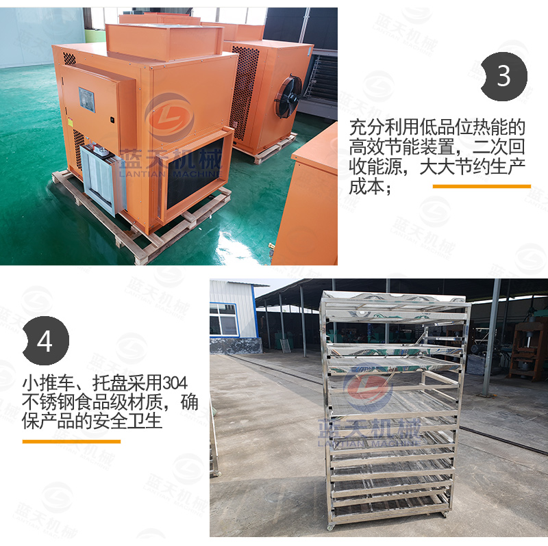 干燥烘干地瓜。干燥烘干地瓜有兩種辦法,一種是通過日曬的辦法,一般不下雨的情況下,在陽光下曬4-5天即可,要定時翻轉。另一種辦法是利用地瓜干烘干設備進行烘干地瓜,這種辦法適合量大,且不受天氣影響。開啟地瓜干烘干設備。將已經擺好托盤的地瓜推進去地瓜干烘干機內,關閉房門。通過智能控制面板,設置好溫度和濕度,一般設置為四個階段,一階段設定45℃,定時2~3小時。二階段溫度設定50℃,定時3小時。三階段溫度設定60℃,定時3小時。四階段溫度設定70℃,定時3小時。一般用時12個小時即可。