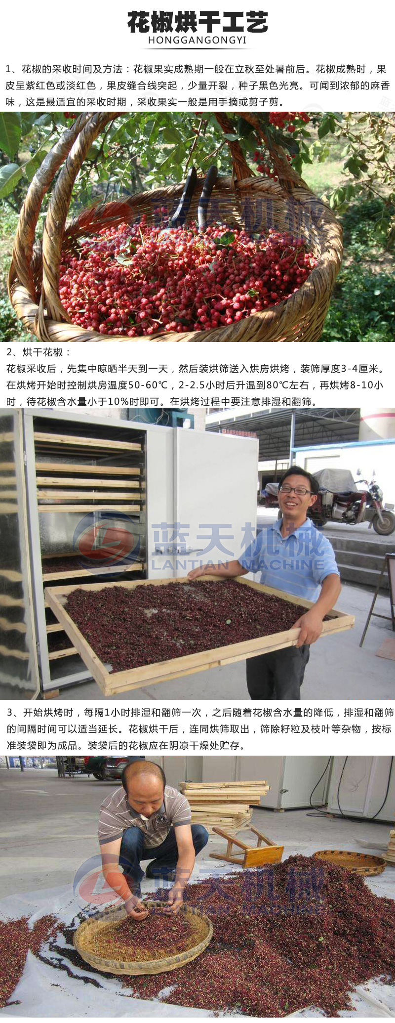 三、晾曬工作晾曬對花椒品質(zhì)特別對色澤的影響較大,應(yīng)選晴朗天氣采摘,采摘的椒果要及時運回晾曬,當(dāng)天采收的椒果當(dāng)天晾曬,未曬干的,攤放在避雨通風(fēng)的地方。陰雨天露水過大的天氣不要采摘。目前我們可以采用花椒烘干機(jī),從而快捷、經(jīng)濟(jì)地將剛采摘下來的花椒及時通過小型花椒烘干機(jī)烘干,保證花椒的色澤和品質(zhì)。但要特別注意溫度調(diào)節(jié)控制,以免影響種子的質(zhì)量。