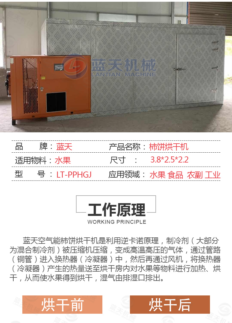 傳統(tǒng)的柿餅的生產(chǎn)周期傳統(tǒng)的自然晾曬所需要的一月有余,而采用熱泵柿餅烘干機則縮短到4-5天(根據(jù)使用時的溫濕度確定),并且在質(zhì)量上優(yōu)于自然涼曬的柿餅。在脫澀期溫度不能超過45度,濕度保持32%上下;前期烘烤期排濕不能太大,以免結(jié)皮太早以及影響回軟過程;第一次捏餅,第二次捏餅,手要輕,力要勻!大量脫水期溫度不能超過65度,濕度不能高于45度。統(tǒng)而言之為“兩烘兩停三捏”的全自動控制烘干方法。