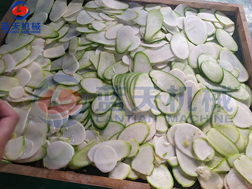 3、經(jīng)過前兩道工序后,把蘿卜片平鋪在蘿卜片烘干機(jī)的物料托盤上,推進(jìn)蔬菜烘干機(jī)進(jìn)行烘干